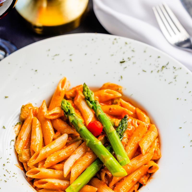 Pasta with fresh salmon, asparagus and vodka sauce