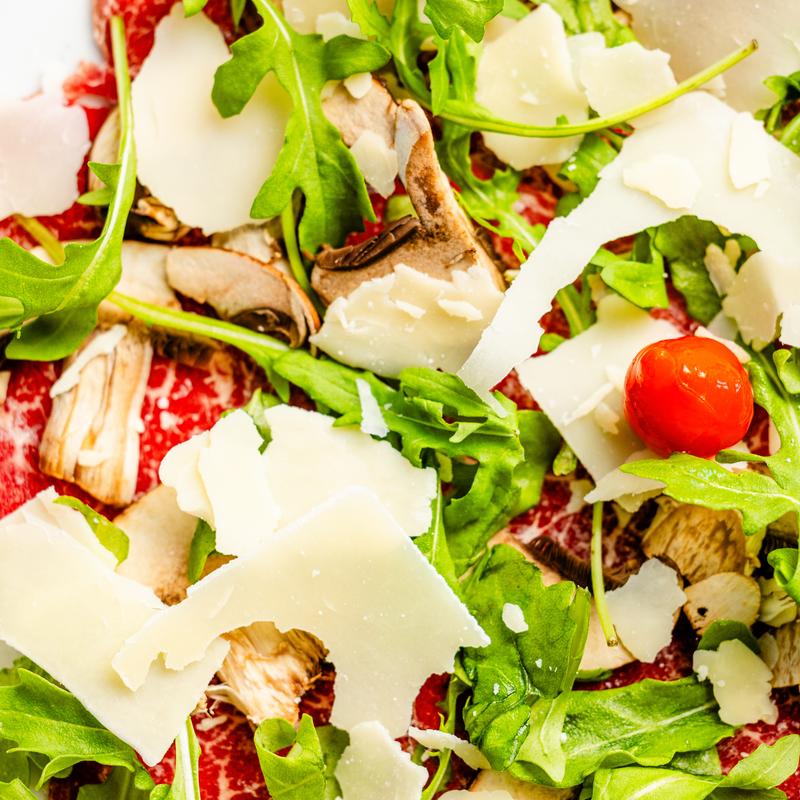 Tagliohni, cherry tomatoes, olives, capers, mushrooms, arugula, mozzarella and tomato sauce